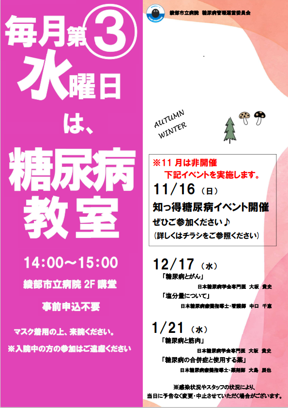 毎回テーマを決め、1回のみの参加でも理解できる内容です。 ※11月はイベントの為、糖尿病教室は非開催 ◎12月17日(水) 「糖尿病とがん」「塩分量について」 ◎1月21日(水) 「糖尿病と筋肉」「糖尿病の合併症と使用する薬」 |