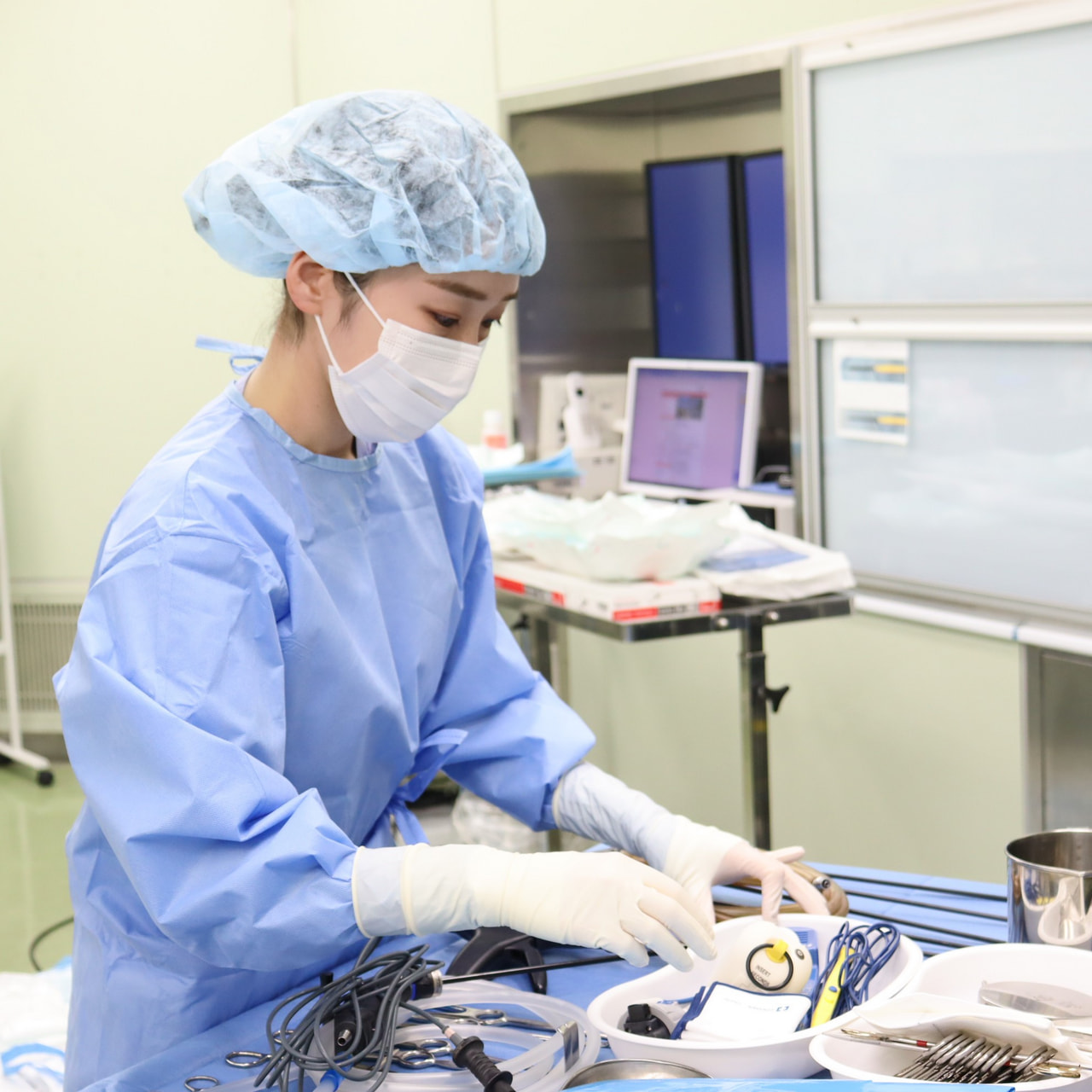 ・2年半の病棟勤務後、現在は手術室・中央材料室で勤務しています。手術の器械出しを担当するときは、手術が円滑に進むように予測しながら医師に手術器械を渡すようにしています。外回りを担当するときには患者さんに寄り添い、少しでも不安が軽減するように関わるよう心掛けています。手術前に得た情報をもとに、他スタッフとも情報共有してあらゆるリスクの予測と対応ができるよう準備をしています。