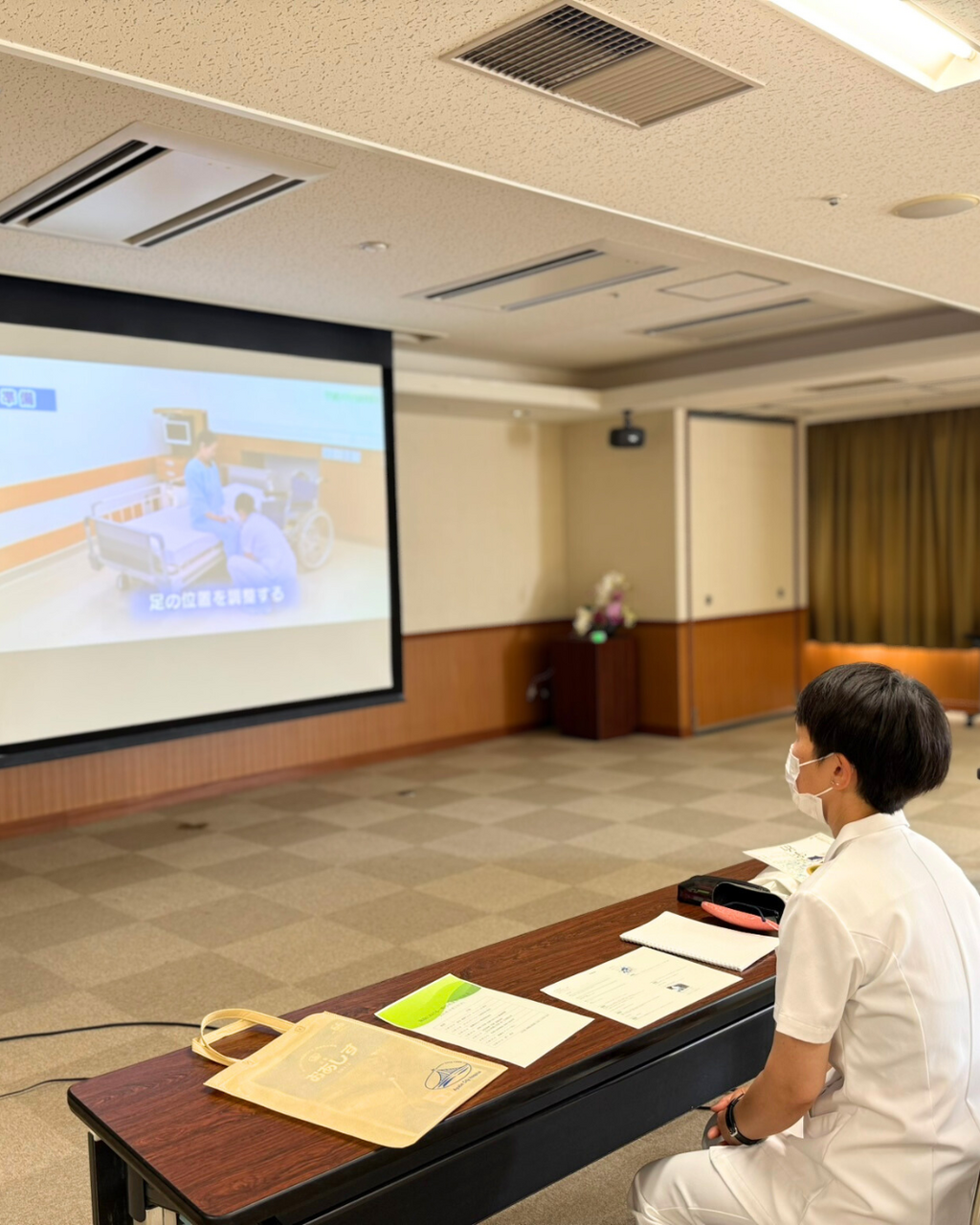 車いす移乗、安全な食事介助について、胃ろうからの栄養法、経腸栄養ポンプの取り扱いなどの看護技術についてまずは映像で確認していただきました。