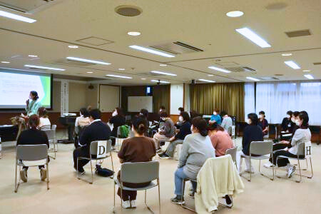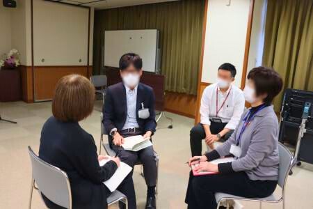 もみじヶ丘病院の臨床心理士の先生をお迎えし、患者さんやご家族のお話をどのように受けとめ、寄り添って「聴く」ことが大切かについて学びました。講義のほか、日頃の支援を振り返るグループディスカッションも行い、参加者同士で意見を交わしました。