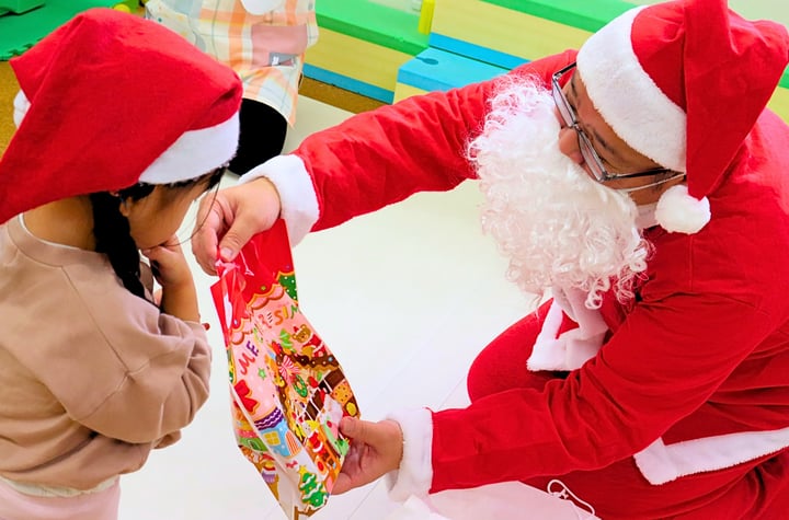 サンタさんからの問いかけに、恥ずかしそうにしながらも頑張ってお返事をしたり、「ありがとう」とプレゼントを受け取ったりと、子どもたちは温かいひとときを過ごしました。