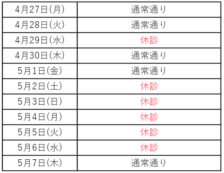 患者様・一般の方へ 2026年04月27日 ゴールデンウィークの休診のお知らせ 下記のとおりゴールデンウィークの期間中、休診となりますのでご了承ください。 救急患者さんへの対応○休診日であっても、救急患者さんへの診療は行います。○当番医師が診察を行いますが、必ずしも専門の医師とは限りませんので予めご了承お願いします。○多くの救急患者さんが来院された場合、また病状等によりお待ちいただくことがございますので併せてご了承お願いします。時間外診療について 前の記事 一覧に戻る 次の記事