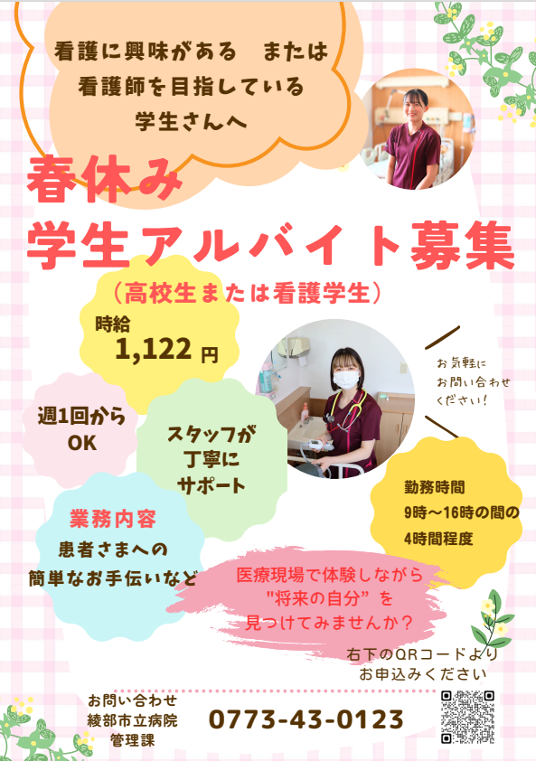 看護学生・高校生の方へ 実際の医療現場でスタッフの一員として 現場を体験しながら”将来の自分”を見つけてみませんか? ・看護の現場をもっと知りたい方・就職を地元の病院でと考えている方 スタッフが丁寧にサポートします働きながら学べる貴重な経験になります 業務内容 清拭介助、手浴・足浴散歩・病棟リハビリ補助など 勤務時間 ①長期休暇時(夏休み・冬休みなど) 9時~19時の間で2~4時間程度(応相談)②学校終了後~19時まで(応相談) 週1日~O.K 学校や部活との両立応援! 時給 1,122円 申し込み 申し込みフォーム お問合せ先 綾部市立病院 管理課TEL 0773-43-0123